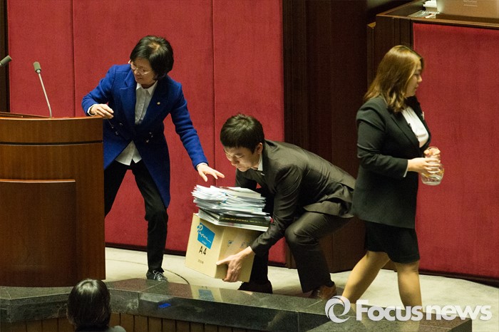 (서울=포커스뉴스) 테러방지법 직권상정에 반발해 야당이 무제한 토론(필리버스터)를 나흘째 진행하고 있는 26일 오후 서울 여의도 국회 본회의장에서 김현(왼쪽) 더불어민주당 의원이 토론을 마친 뒤 자료를 정리하고 있다.