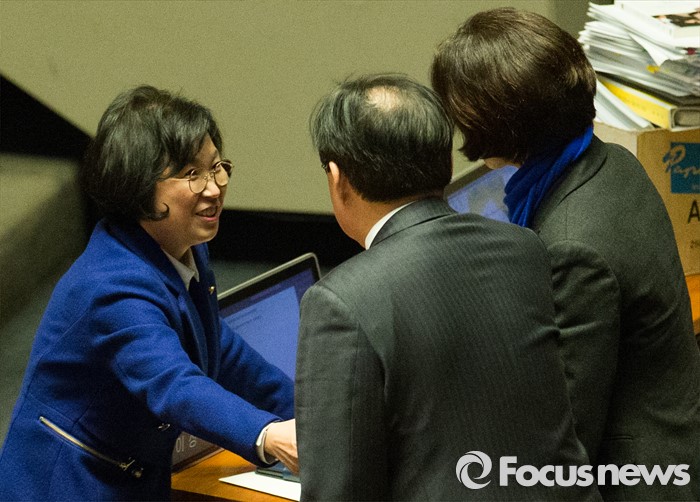 (서울=포커스뉴스) 테러방지법 직권상정에 반발해 야당이 무제한 토론(필리버스터)를 나흘째 진행하고 있는 26일 오후 서울 여의도 국회 본회의장에서 김현(왼쪽) 더불어민주당 의원이 토론을 마친 뒤 동료 의원들의 격려를 받으며 퇴장하고 있다.