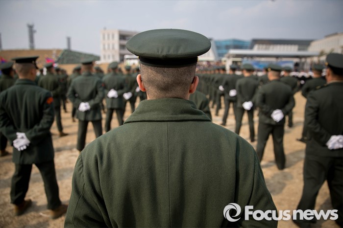 (서귀포=포커스뉴스) 26일 오후 제주 서귀포 제주해군기지에서 열린 '제주민군복합형관광미항' 준공식에 해병대 장병들이 도열해있다.