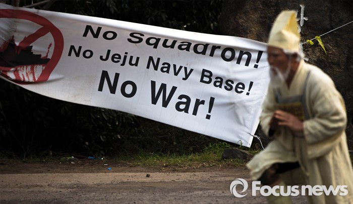 (서귀포=포커스뉴스) 26일 오전 제주 서귀포시 강정마을에서 주민들과 기지 건설을 반대하는 활동가들이 준공식이 열리는 제주 군복합형관광미항(제주해군기지) 정문 앞 부근에서 시위를 하고 있다.
