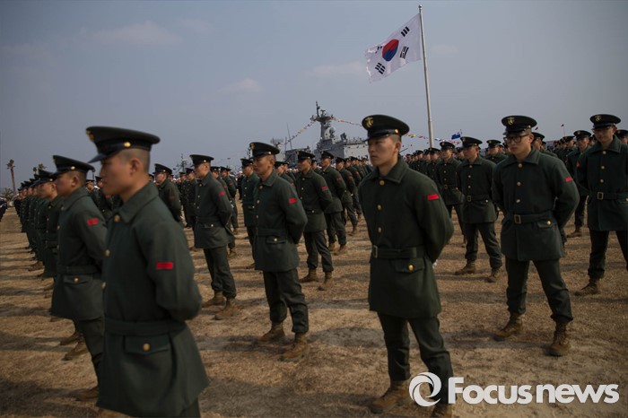 (서귀포=포커스뉴스) 26일 오후 제주 서귀포 제주해군기지에서 열린 '제주민군복합형관광미항' 준공식에 해병대 장병들이 도열해있다.