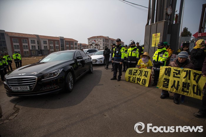 (서귀포=포커스뉴스) 26일 오전 준공식이 열리는 제주민군복합형관광미항(제주해군기지) 정문 앞 부근에서 기지 건설을 반대하며 시위하는 강정마을 주민 및 활동가들 옆으로 준공식 행사 차량이 기지를 빠져나오고 있다.