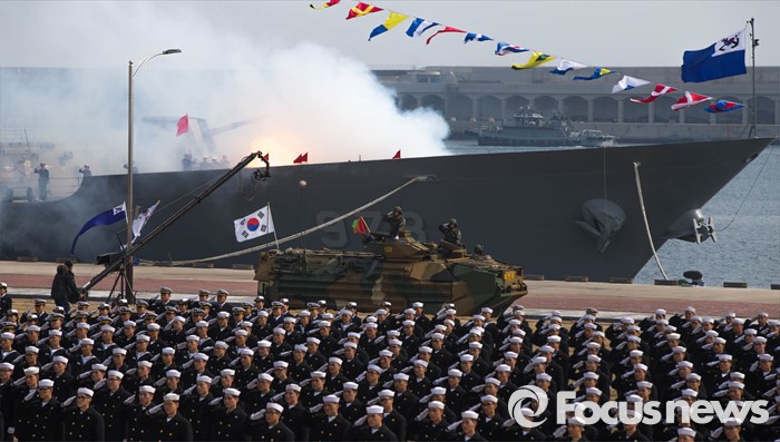 (서귀포=포커스뉴스) 26일 오후 제주 서귀포 제주해군기지에서 열린 '제주민군복합형관광미항' 준공식에서 축포가 발사되고 있다.