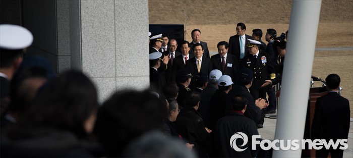 (서귀포=포커스뉴스) 황교안 국무총리가 26일 오후 제주 서귀포 제주해군기지에서 열린 '제주민군복합형관광미항' 준공식 참석, 자리로 향하고 있다.