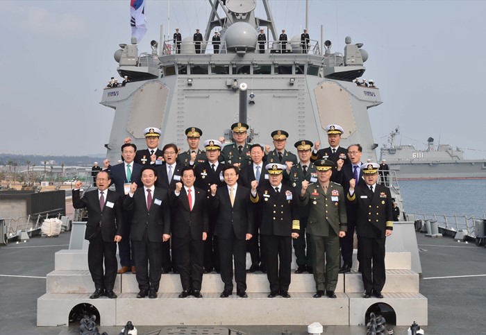 (서울=포커스뉴스) 황교안 국무총리가 26일 오후 제주 서귀포 제주해군기지에서 열린 제주민군복합형관광미항 준공식에 참석해 이지스구축함 서애류성룡함에서 기념촬영을 하고 있다. <사진제공=해군>