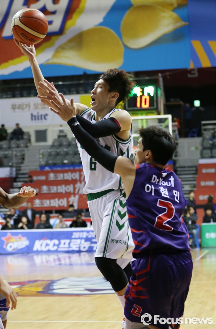 (고양=포커스뉴스) 26일 고양체육관에서 열린 2015-2016 프로농구 오리온-동부 6강 플레이오프 1차전에서 동부 두경민이 오리온 이현민의 수비를 뚫으며 레이업슛을 시도하고 있다.