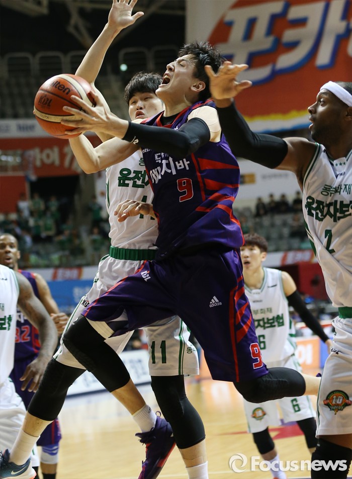 (고양=포커스뉴스) 26일 고양체육관에서 열린 2015-2016 프로농구 오리온-동부 6강 플레이오프 1차전에서 오리온 최진수가 동부 박지현과 벤슨의 수비 사이로 레이업슛을 시도하고 있다.
