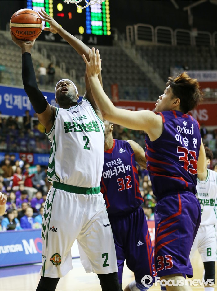 (고양=포커스뉴스) 26일 고양체육관에서 열린 2015-2016 프로농구 오리온-동부 6강 플레이오프 1차전에서 동부 벤슨이 오리온 이승현과 헤인즈의 마크를 제치며 골밑슛을 시도하고 있다.