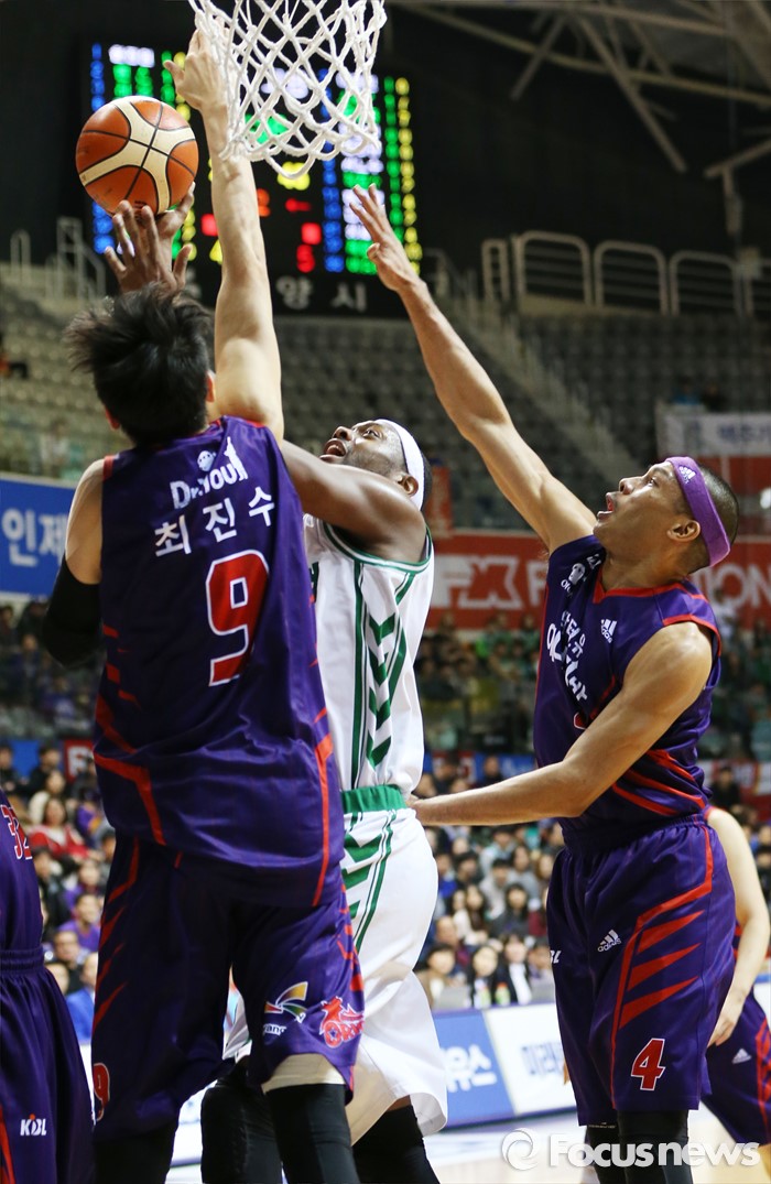 (고양=포커스뉴스) 26일 고양체육관에서 열린 2015-2016 프로농구 오리온-동부 6강 플레이오프 1차전에서 오리온 최진수가 동부 벤슨의 슈팅때 블록을 시도하고 있다.