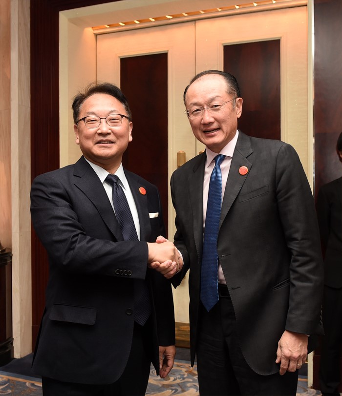 (서울=포커스뉴스) G20재무장관·중앙은행총재회의 참석차 중국 상해를 방문중인 유일호 경제부총리 겸 기획재정부 장관이 26일 오후(현지시간) 푸동 상글리라 호텔에서 김용 세계은행(WB) 총재와 면담에 앞서 악수를 하고 있다. <사진제공=기획재정부>