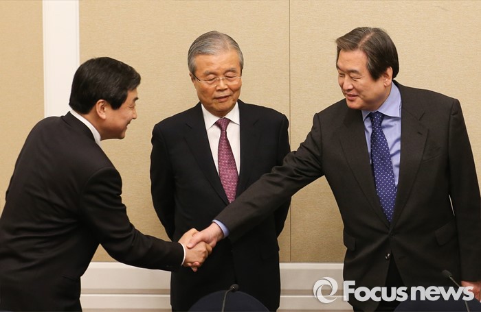 (서울=포커스뉴스) 테러방지법 직권상정에 반발해 야당이 무제한 토론(필리버스터)를 나흘째 진행하고 있는 26일 오후 서울 여의도 국회 귀빈식당에서 선거구 획정 및 쟁점법안 논의를 위해 열린 여야 지도부 회동에 참석한 김무성(오른쪽) 새누리당 대표와 이종걸(왼쪽) 더불어민주당 원내대표가 인사하고 있다. 가운데는 김종인 더민주 비대위 대표.