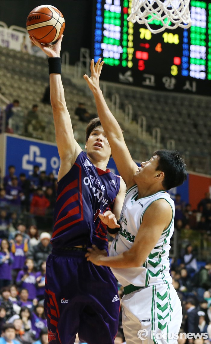 (고양=포커스뉴스) 26일 고양체육관에서 열린 2015-2016 프로농구 오리온-동부 6강 플레이오프 1차전에서 오리온 장재석이 동부 한정원의 블록을 피해 점프슛을 시도하고 있다.