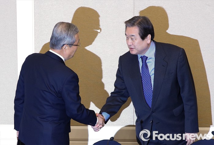 (서울=포커스뉴스) 테러방지법 직권상정에 반발해 야당이 무제한 토론(필리버스터)를 나흘째 진행하고 있는 26일 오후 서울 여의도 국회 귀빈식당에서 선거구 획정 및 쟁점법안 논의를 위해 열린 여야 지도부 회동에 참석한 김무성(오른쪽) 새누리당 대표와 김종인 더불어민주당 비대위 대표가 악수하고 있다.