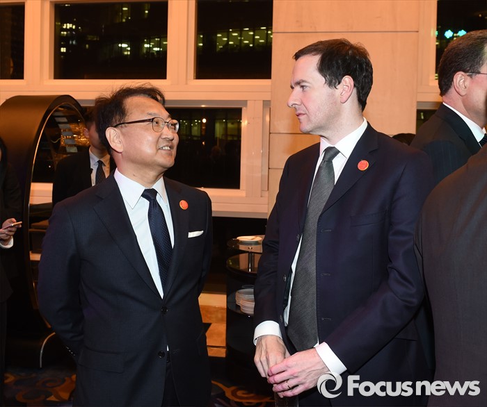 (서울=포커스뉴스) G20재무장관.중앙은행총재회의 참석차 중국 상해를 방문중인 유일호 부총리 겸 기획재정부 장관이 26일 저녁(현지시간) 푸동 상글리라 호텔에서 열린 환영리셉션에서 조지 오스본 영국 재무장관과 환담을 나누고 있다. <사진제공=기획재정부>