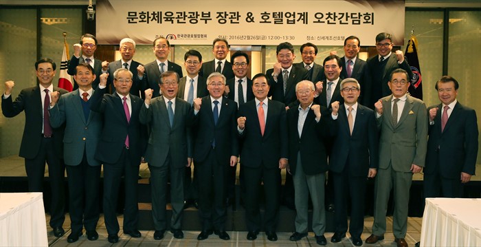 (서울=포커스뉴스) 김종덕(앞줄 왼쪽 다섯번째) 문화체육관광부 장관이 26일 서울 중구 조선호텔에서 열린 '호텔업계 간담회'에 참석해 유용종(앞줄 오른쪽 다섯번째) 호텔협회장 등 참석자들과 기념촬영을 하고 있다. <사진제공=문화체육관광부>