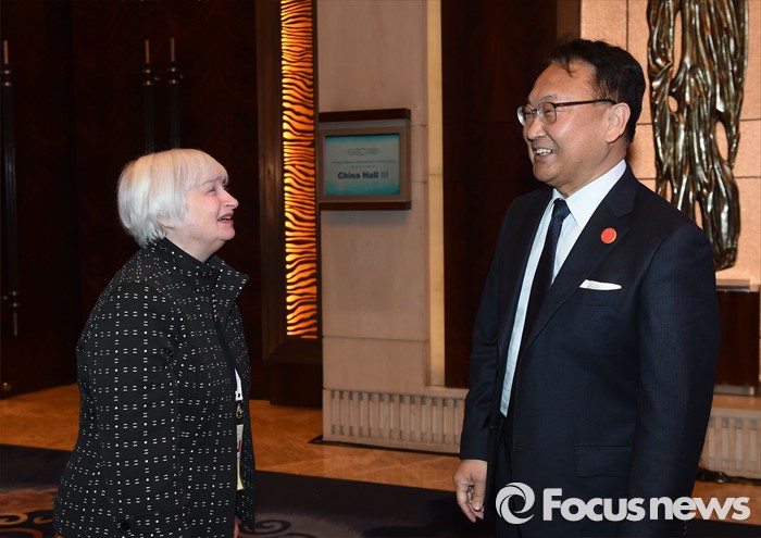 (서울=포커스뉴스) G20재무장관.중앙은행총재회의 참석차 중국 상해를 방문중인 유일호 부총리 겸 기획재정부 장관이 26일 저녁(현지시간) 푸동 상글리라 호텔에서 열린 환영리셉션에서 재닛 옐런 FRB 의장과 환담을 나누고 있다. <사진제공=기획재정부>