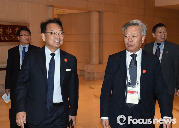 (서울=포커스뉴스) G20재무장관.중앙은행총재회의 참석차 중국 상해를 방문중인 유일호 부총리 겸 기획재정부 장관이 26일 저녁(현지시간) 푸동 상글리라 호텔에서 열린 환영리셉션에서 진리췬 AIIB 총재와 대화를 나누고 있다. <사진제공=기획재정부>