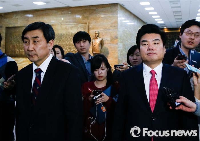 (서울=포커스뉴스) 26일 오후 서울 여의도 국회 귀빈식당에서 선거구 획정 및 쟁점법안 논의를 위해 진행된 여야 지도부 회동을 마친 원유철(오른쪽) 새누리당 원내대표와 이종걸 더불어민주당 원내대표가 이동하고 있다. 이날 여야 회동은 결렬됐다.