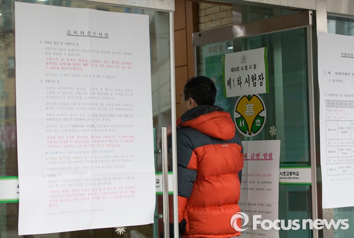 (서울=포커스뉴스) 27일 오전 서울 서초고등학교에서 제58회 사법시험 제1차시험에 응시한 수험생들이 시험실로 입실하고 있다. 최근 법무부가 사법시험 폐지를 4년 유예하겠다는 입장을 밝혔으나, 내년 변호사시험법 개정작업이 사실상 중단된 상태여서 사시 존폐 여부가 불투명한 상황이다.