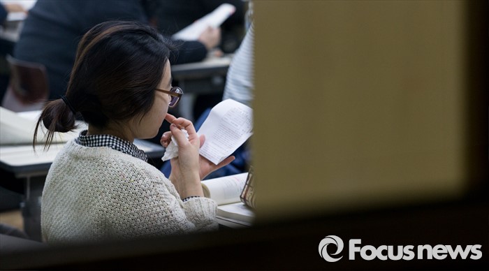 (서울=포커스뉴스) 27일 오전 서울 서초고등학교에서 제58회 사법시험 제1차시험에 응시한 수험생들이 시험전 마지막 복습을 하고 있다. 최근 법무부가 사법시험 폐지를 4년 유예하겠다는 입장을 밝혔으나, 내년 변호사시험법 개정작업이 사실상 중단된 상태여서 사시 존폐 여부가 불투명한 상황이다.