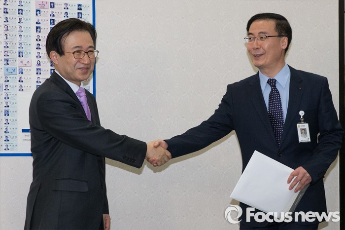 (서울=포커스뉴스) 김세환(오른쪽) 선거구획정위원횐 사무국장이 28일 오전 서울 여의도 국회의장실을 방문해 이명우 정무수석 비서관에게 국회의원 지역선거구 획정안을 전달하기 전 악수를 하고 있다.
