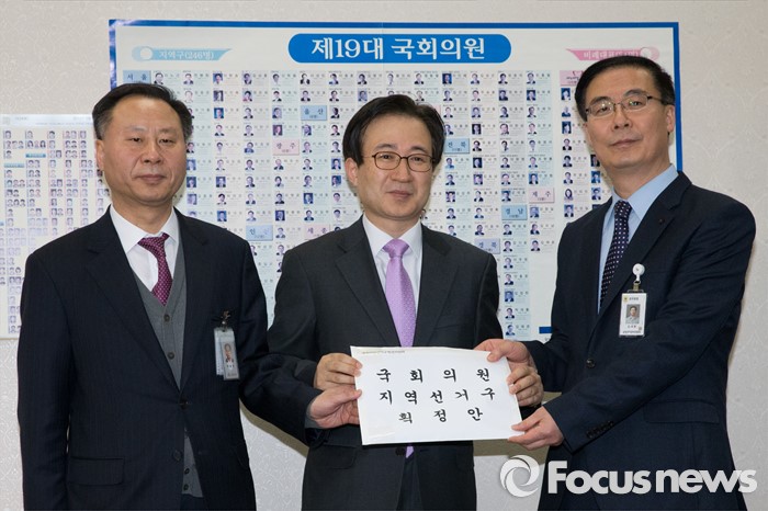 (서울=포커스뉴스) 김세환(오른쪽) 선거구획정위원횐 사무국장이 28일 오전 서울 여의도 국회의장실을 방문해 이명우 정무수석 비서관에게 국회의원 지역선거구 획정안을 전달하고 있다. 왼쪽부터 박수철 안행위 수석전문위원, 이명우 정무수석 비서관, 김세환 선거구획정위원회 사무국장.