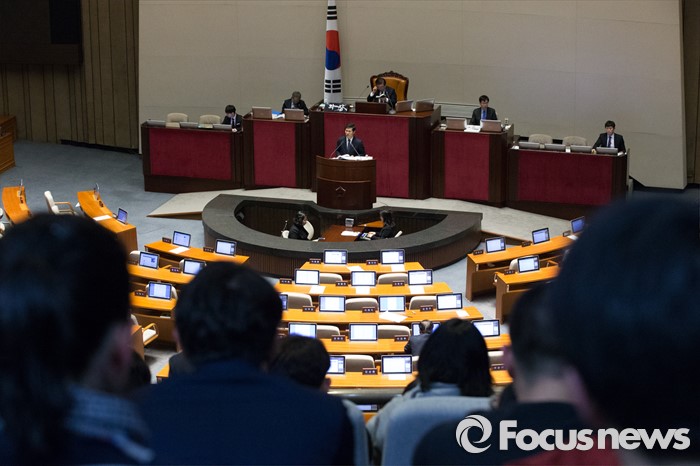 (서울=포커스뉴스) 테러방지법 직권상정에 반발해 야당의 무제한 토론(필리버스터)이 진행되고 있는 28일 오후 서울 여의도 국회 본회의 장에서 23번째 토론에 참여한 이학영 더불어민주당 의원이 발언하고 있는 가운데 시민 방청객들이 지켜보고 있다.
