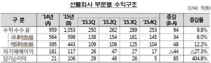 선물사의 당기순익 증가는 파생상품 수탁수수료 증가에 기인했다. 수익 구조를 살펴보면 해외파생상품의 수탁수수료가 크게 증가했다. 2015년 중 해외파생상품의 수수료는 전년 395억원 대비 48억원(12.2%) 늘어난 443억원으로 집계됐으며 국내파생상품의 수수료도 전년 564억원에 비해 34억원(6.0%) 증가한 598억원으로 나타났다.