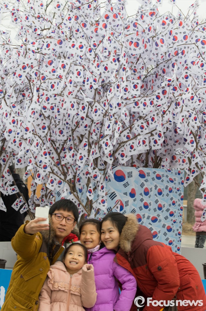 (천안=포커스뉴스) 3.1절을 이틀 앞둔 28일 오후 충남 천안 독립기념관을 찾은 시민들이 광장에 마련된 태극기 나무 앞에서 단체사진을 찍고 있다.