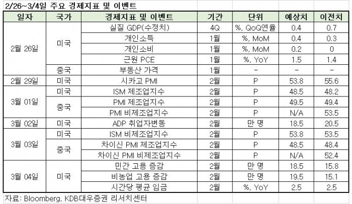이번주 주목할 이벤트와 경제지표는 ▲중국 2월 차이신 구매관리지수(PMI) 제조업 발표 ▲미국 2월 고용보고서 발표 등이 있다.