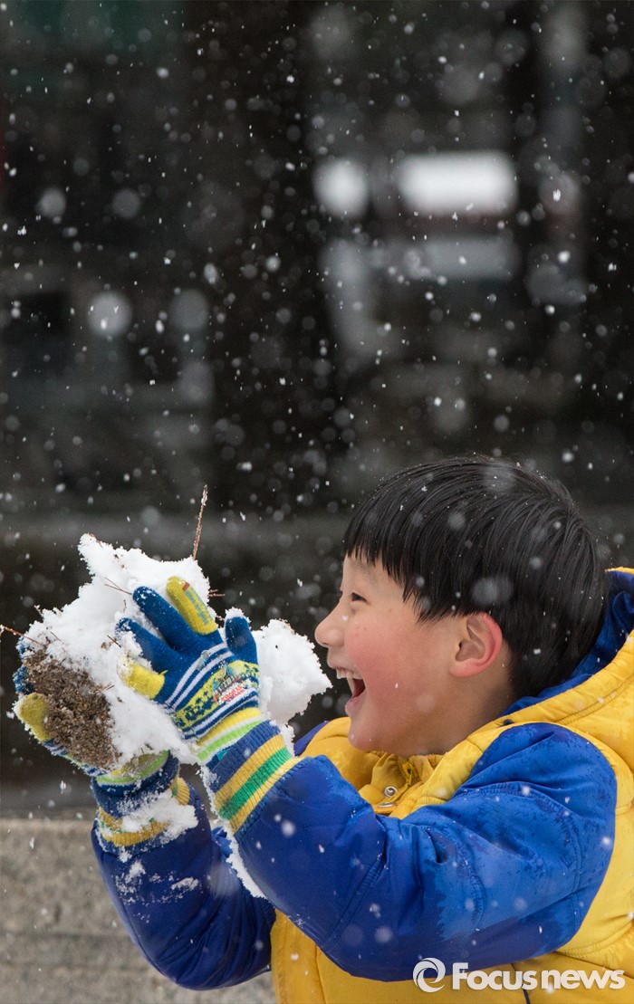(서울=포커스뉴스) 수도권과 전국 곳곳에에 강한 바람과 함께 기습적인 폭설이 내린 28일 오후 서울 강북구 솔밭공원에서 한 어린이가 즐겁게 뛰어놀고 있다.