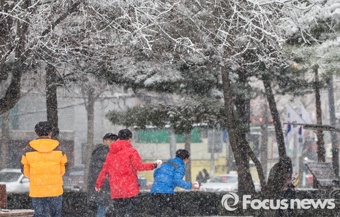 (서울=포커스뉴스) 수도권과 전국 곳곳에에 강한 바람과 함께 기습적인 폭설이 내린 28일 오후 서울 강북구 솔밭공원에서 학생들이 눈싸움을 하고 있다.