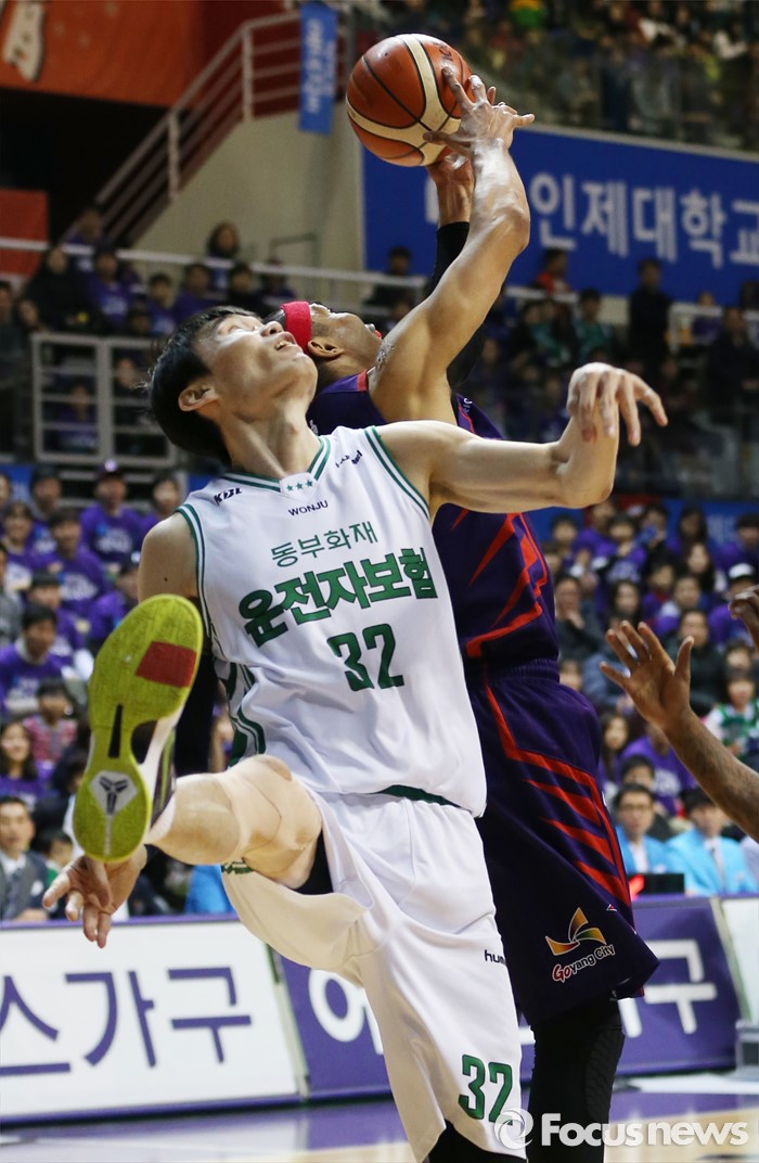 (고양=포커스뉴스) 28일 고양체육관에서 열린 2015-2016 프로농구 오리온-동부 6강 플레이오프 2차전에서 오리온 문태종이 동부 김주성을 제치며 리바운드볼을 잡고 있다.