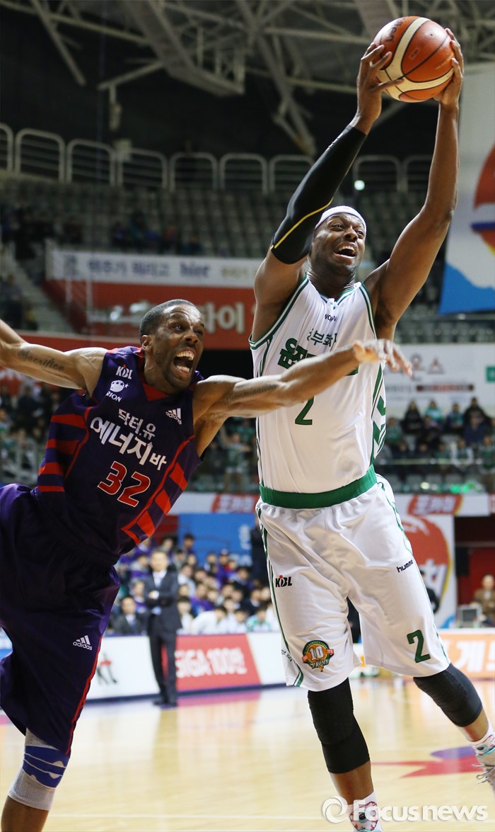 (고양=포커스뉴스) 28일 고양체육관에서 열린 2015-2016 프로농구 오리온-동부 6강 플레이오프 2차전에서 동부 벤슨이 오리온 헤인즈와의 리바운드 다툼에서 볼을 잡아내고 있다.
