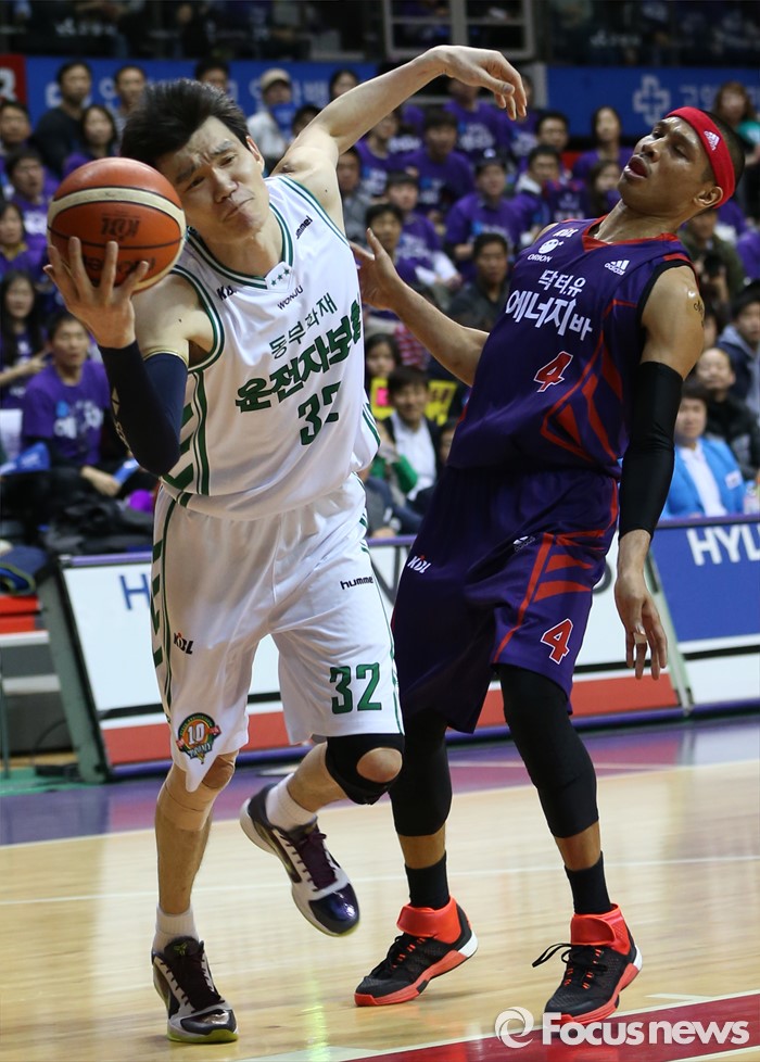 (고양=포커스뉴스) 28일 고양체육관에서 열린 2015-2016 프로농구 오리온-동부 6강 플레이오프 2차전에서 동부 김주성이 리바운드볼을 잡다 오리온 문태종과 충돌하며 넘어지고 있다.