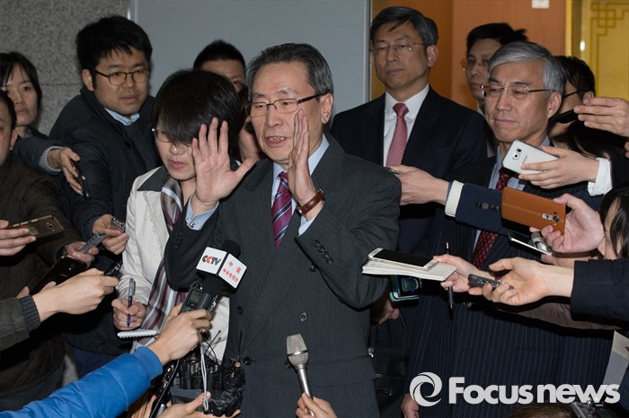 (서울=포커스뉴스) 중국 측 수석대표인 우다웨이 중국 외교부 한반도사무특별대표가 28일 오후 서울 종로구 외교부 청사에서 북핵 6자회담의 우리 측 수석대표인 황준국 외교부 한반도평화교섭본부장과의 면담을 끝내고, 취재진의 질문에 대답하고 있다.