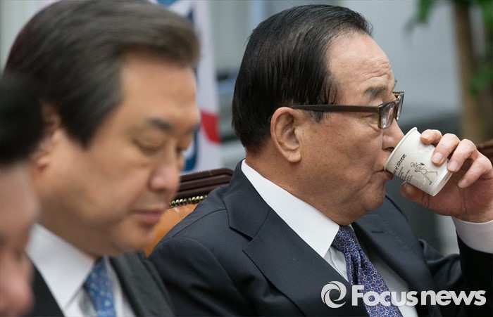 (서울=포커스뉴스) 서청원 새누리당 최고위원이 29일 오전 서울 여의도 국회에서 열린 최고위원회의에 참석해 물을 마시고 있다. 왼쪽은 김무성 대표.