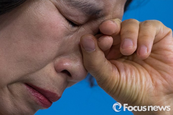 (서울=포커스뉴스) 더불어민주당의 '현역의원 평가 하위 20%'에 걸려 컷오프(공천배제)된 전정희 의원이 29일 오전 서울 여의도 국회 정론관에서 탈당 기자회견을 하며 눈물을 닦고 있다.