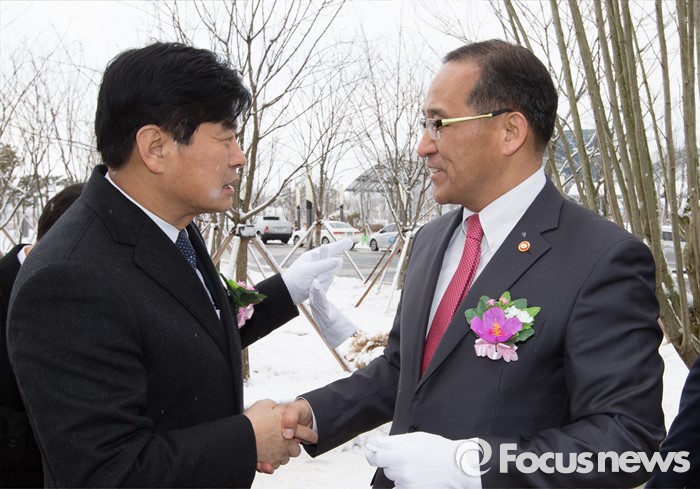 (세종=포커스뉴스) 홍윤식(오른쪽) 행정자치부 장관이 29일 오전 세종시 어진동 대통령기록관 전시관 입구에 마련된 무궁화정원 개장식에서 이춘희 세종시장과 대화를나누고 있다.