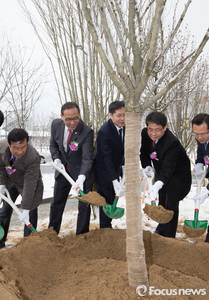 (세종=포커스뉴스) 홍윤식(왼쪽 두 번째) 행정자치부 장관이 29일 오전 세종시 어진동 대통령기록관 전시관 입구에 마련된 무궁화정원 개장식에서 시삽을 하고 있다.