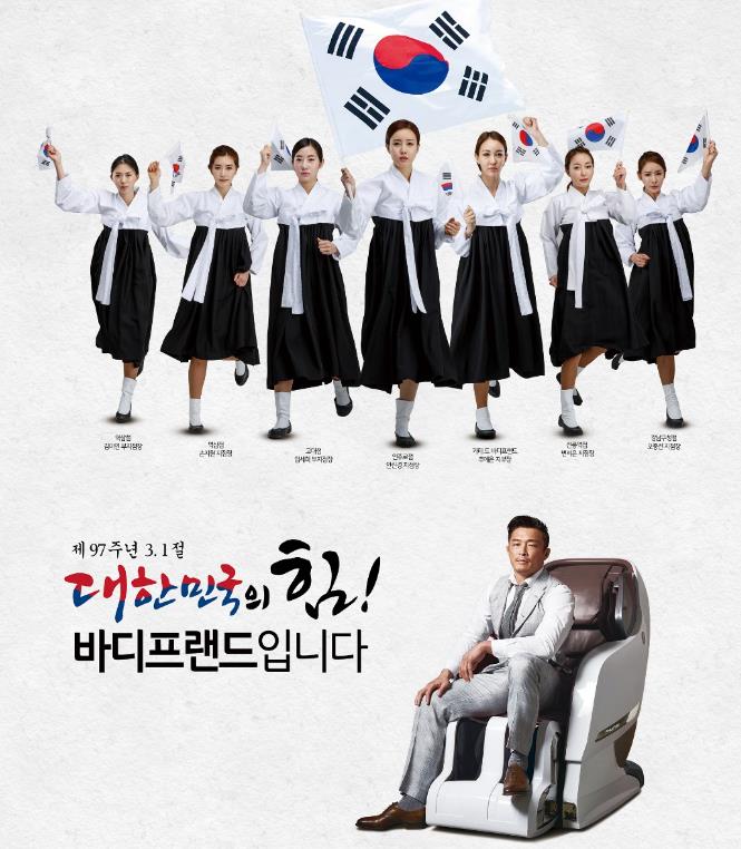 바디프랜드 박상현 대표는 "많은 국민들과 국권 회복을 위해 희생하신 선열들의 위업을 기리는 태극기 게양을 함께 하기 위해 이번 행사를 진행하게 됐다"며 "이번 행사를 통해 3·1절의 의미를 다시 한 번 되새기는 한편 태극기에 대한 전 국민적 관심을 이끄는 계기가 되길 바란다"고 밝혔다.바디프랜드는 올해로 97주년인 3·1 절을 맞아 전국 97개 직영점에서 고급 태극기를 증정한다.<사진제공=바디프랜드>