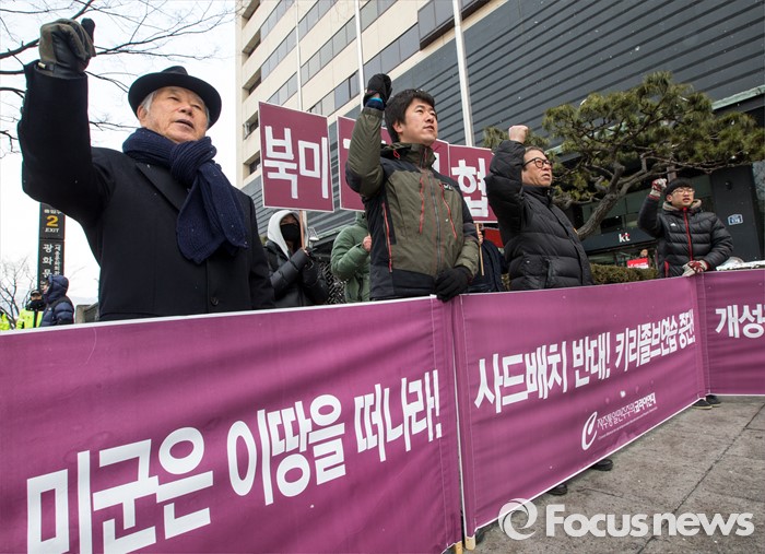 (서울=포커스뉴스) 29일 오후 서울 종로구 주한 미국대사관 옆에서 코리아연대 회원들이 '북미평화협정 체결 및 키리졸브훈련 반대'를 주장하는 구호를 외치고 있다.