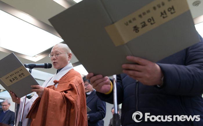 (서울=포커스뉴스) 29일 오후 서울 중구 프레스센터에서 '3.1 운동의 정신을 이어 민족의 평화와 화해, 신뢰회복을 위한 종교인 기자회견'에 참석한 지홍 스님이 성명서를 낭독하고 있다.