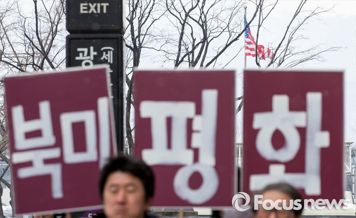 (서울=포커스뉴스) 29일 오후 서울 종로구 주한 미국대사관 옆에서 코리아연대 회원들이 '북미평화협정 체결 및 키리졸브훈련 반대'를 주장하는 구호를 외치고 있다.