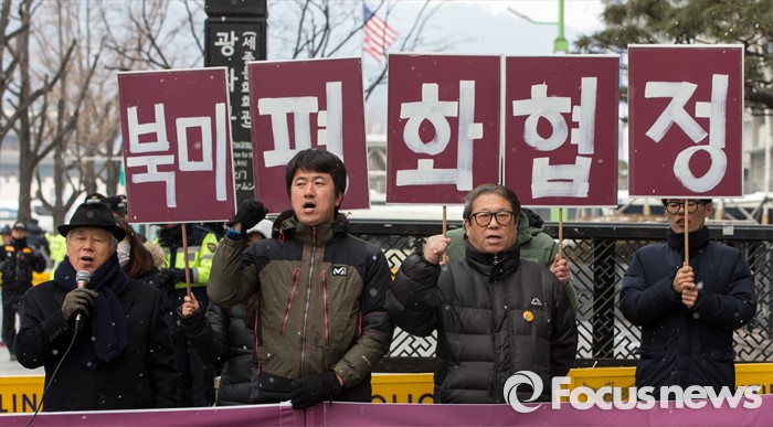 (서울=포커스뉴스) 29일 오후 서울 종로구 주한 미국대사관 옆에서 코리아연대 회원들이 '북미평화협정 체결 및 키리졸브훈련 반대'를 주장하는 구호를 외치고 있다.