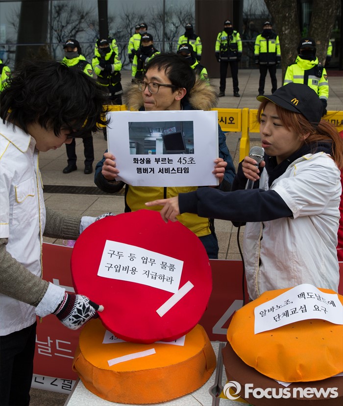 (서울=포커스뉴스) 29일 오전 서울 종로구 한국맥도날드본사 앞에서 알바노조 조합원들이 '45초 햄버거, 17분 30초 배달제 폐지' 등 10대 안건을 들고 단체교섭을 요구하는 퍼포먼스를 하고 있다.