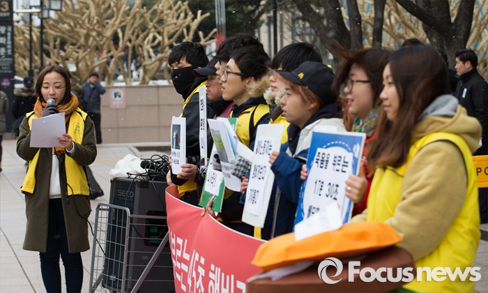 (서울=포커스뉴스) 29일 오전 서울 종로구 한국맥도날드본사 앞에서 알바노조 조합원들이 '45초 햄버거, 17분 30초 배달제 폐지' 등 10대 안건을 들고 단체교섭을 요구하는 기자회견을 하고 있다.