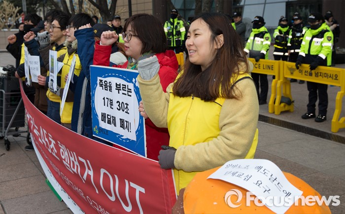 (서울=포커스뉴스) 29일 오전 서울 종로구 한국맥도날드본사 앞에서 알바노조 조합원들이 '45초 햄버거, 17분 30초 배달제 폐지' 등 10대 안건을 들고 단체교섭을 요구하는 기자회견을 하고 있다.