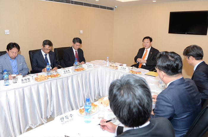 이날 간담회에는 허남덕 곽민수 대우인터내셔널 이사, 김관성 SK네트윅스 부장, 신용우 현대종합상사 부장, 주태근 LG상사 부장, 유재형 대림산업 부장, 김경수 현대건설 부장, 이병욱 현대엔지니어링 부장, 조명규 두산건설 부장, 홍범석 삼성전자 상무, 안득수 LG전자 상무와 산업부 관계자가 참석했다. <사진제공=산업통상자원부>