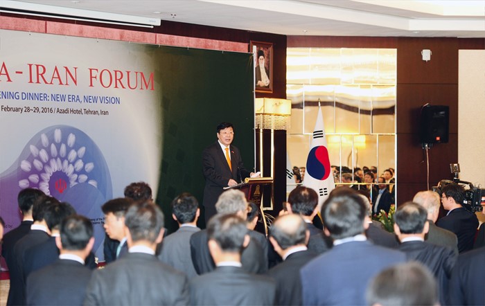 (서울=포커스뉴스) 주형환 산업통상자원부 장관이 28(현지시간) 이란 테헤란 아자디호텔에서 열린 한국-이란 포럼 오프닝 디너에 참석해 축사를 하고 있다. <사진제공=산업통상자원부>